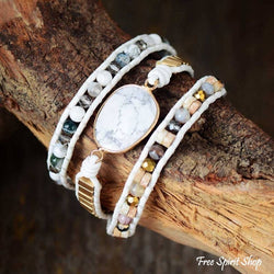 This beautiful beaded wrap bracelet is handmade with natural White Howlite stone and assorted beads. It is mounted on genuine white coated leather. Shipping: all orders are shipped with Fedex or DHL. Estimated shipping costs are as follows: small to medium size orders ($30-$45), medium to large size orders ($45-$60). Please do not take Faire shipping cost estimates in consideration as they are not representative of what we charge for shipping. Materials: Howlite, Assorted Beads, Genuine Leather Metal: Stainless Steel Size: Around 19.6 inches (50 cm) Handmade Artwork Made with Love and carefully manufactured Howlite bracelet, gemstone bracelet, boho style jewelry, boho wrap bracelet, natural stone bracelet, crystal bracelet, handmade wrap bracelet, beaded wrap bracelet, leather wrap bracelet, earthy jewelry, women jewelry, beaded boho bracelet